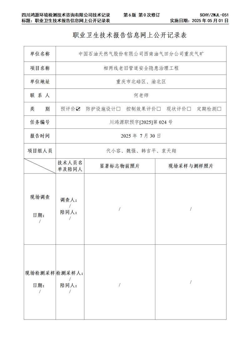 职业卫生技术报告公示 / public notice首页 > 新闻中心 > 中国石油天然气股份有限公司西南油气田分公司重庆气矿职业卫生技术服务项目网上公示单