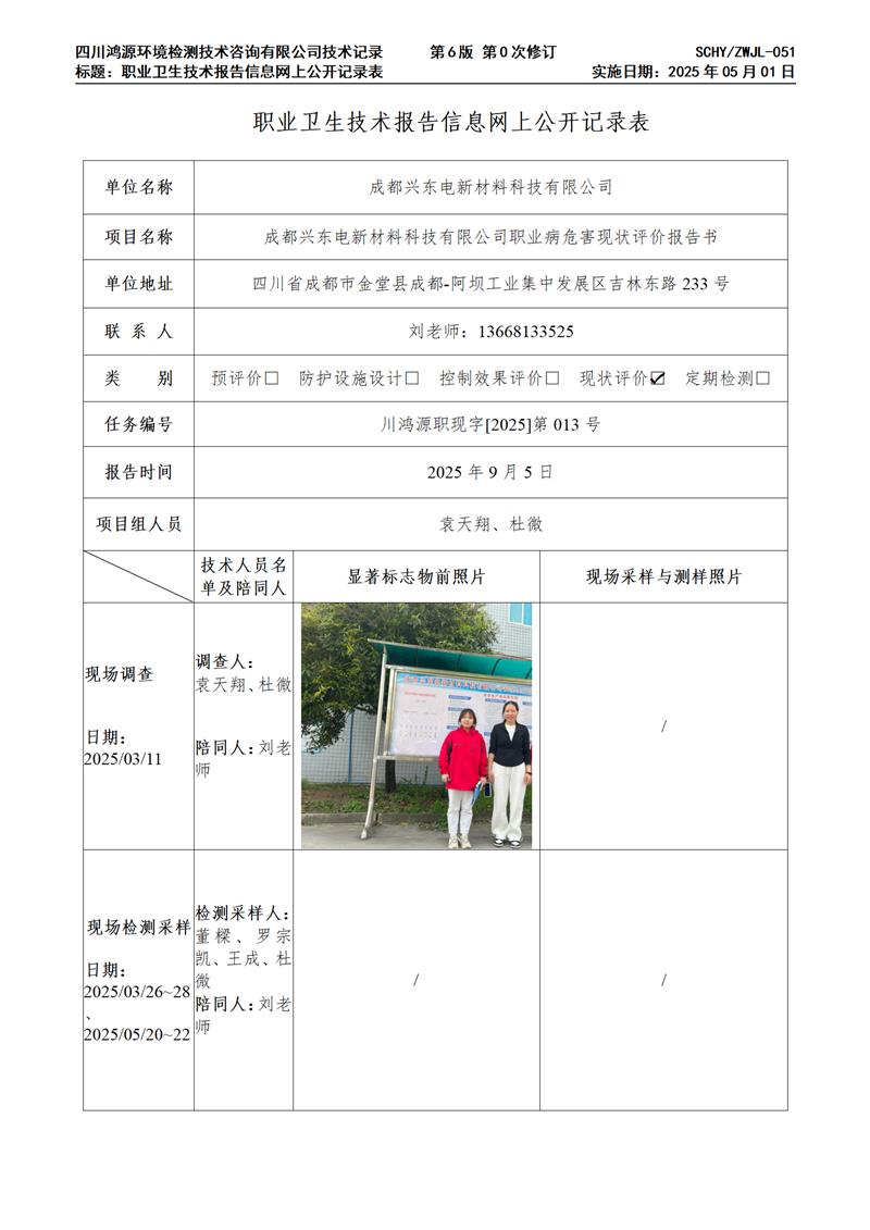 成都兴东电新材料科技有限公司职业卫生技术服务项目网上公示单