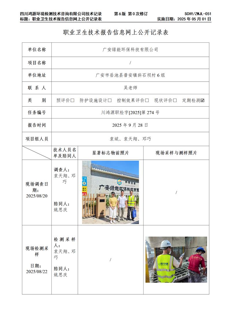 广安绿能环保科技有限公司职业卫生技术服务项目网上公示单