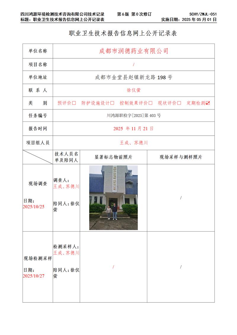 成都市润德药业有限公司职业卫生技术服务项目网上公示单