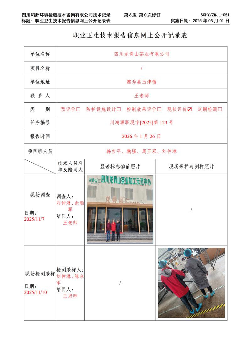 职业卫生技术报告公示 / public notice首页 > 新闻中心 > 四川龙骨山茶业有限公司职业卫生技术服务项目网上公示单