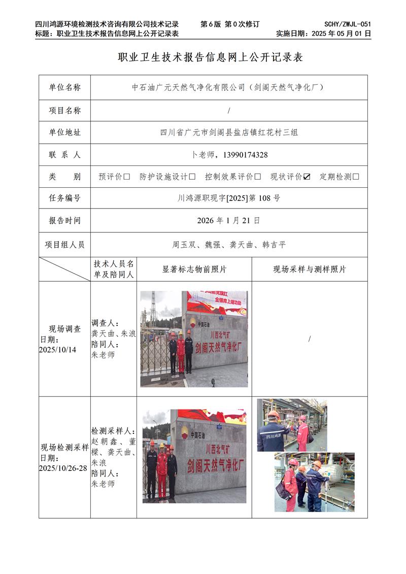 职业卫生技术报告公示 / public notice首页 > 新闻中心 > 中石油广元天然气净化有限公司(剑阁天然气净化厂)职业卫生技术服务项目网上公示单