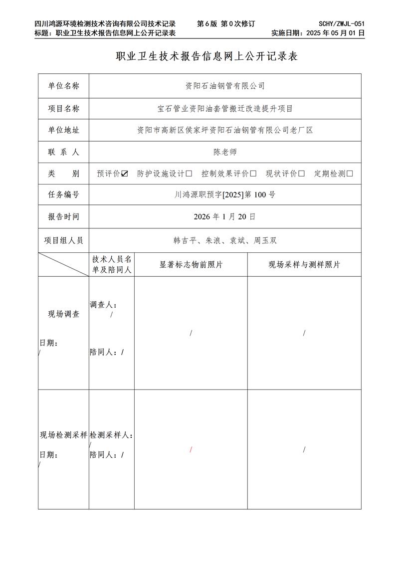 职业卫生技术报告公示 / public notice首页 > 新闻中心 > 资阳石油钢管有限公司职业卫生技术服务项目网上公示单