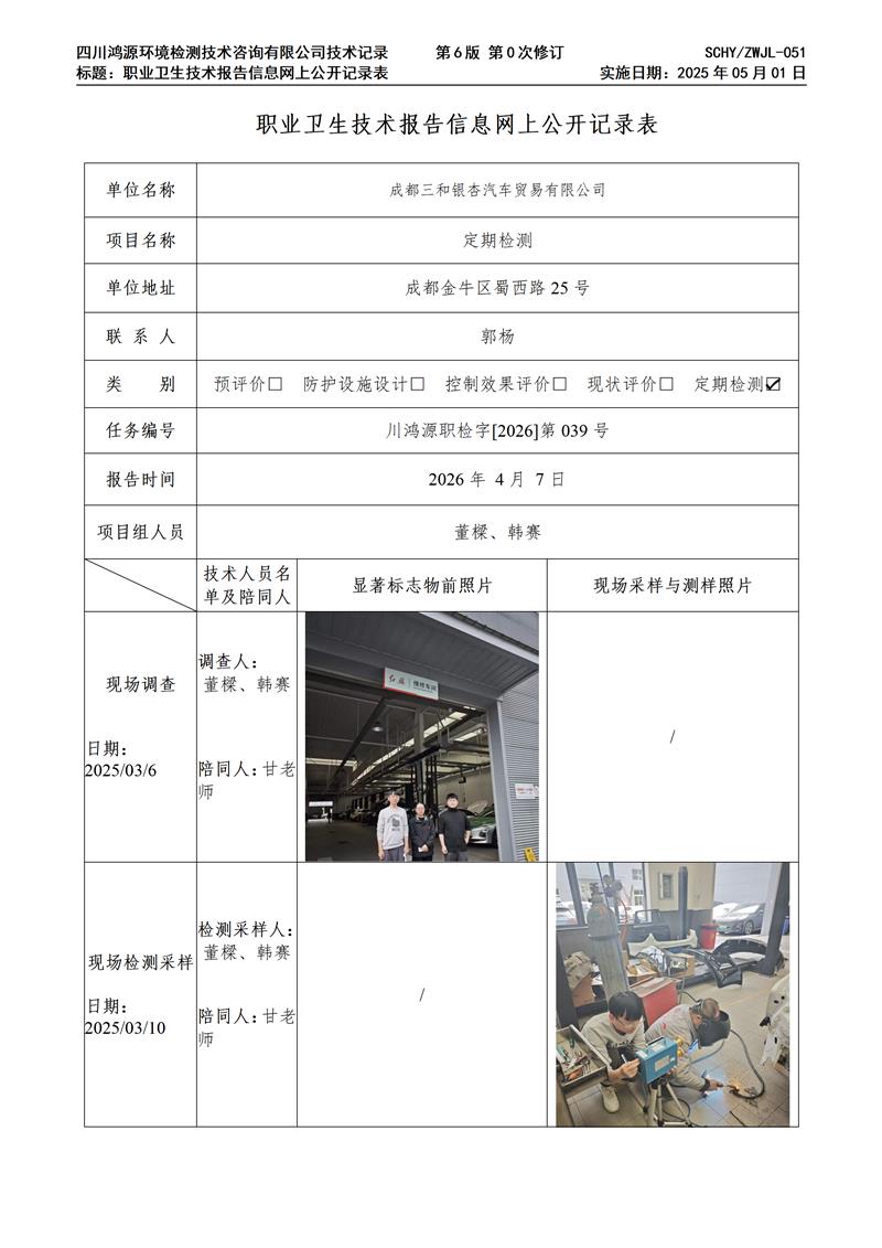 职业卫生技术报告公示 / public notice首页 > 新闻中心 > 成都三和银杏汽车贸易有限公司职业卫生技术服务项目网上公示单