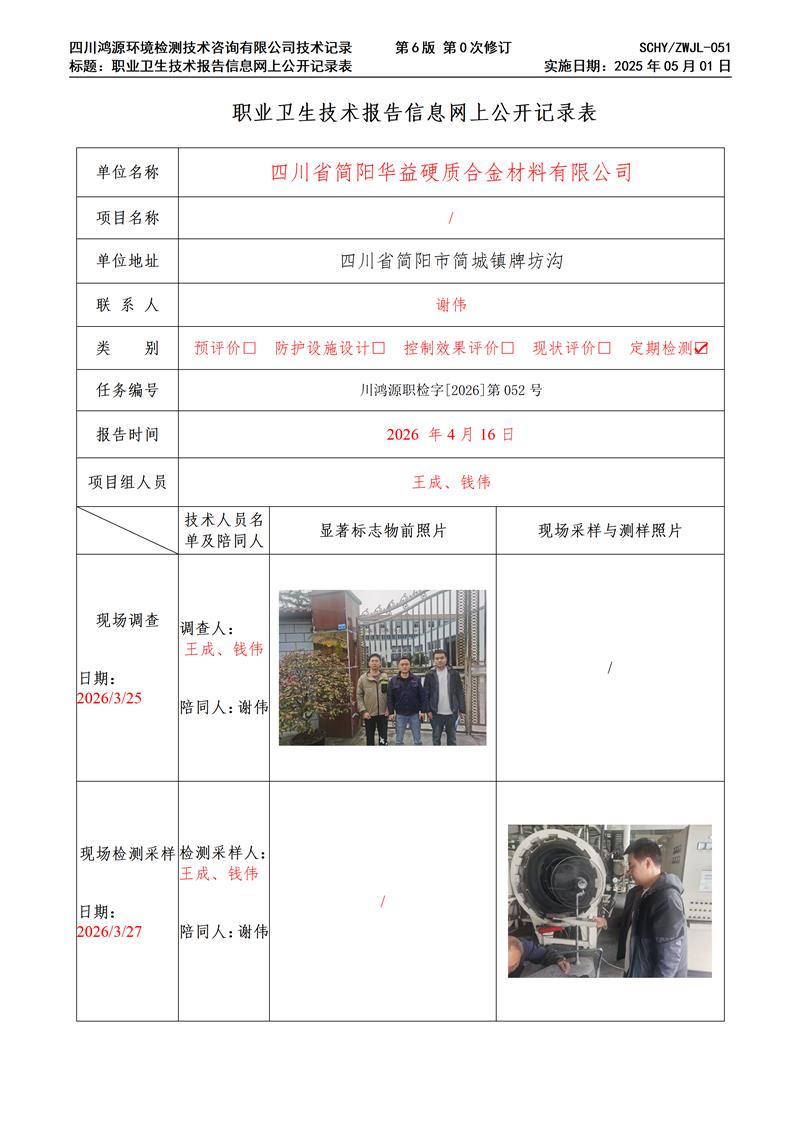 职业卫生技术报告公示 / public notice首页 > 新闻中心 > 四川省简阳华益硬质合金材料有限公司职业卫生技术服务项目网上公示单